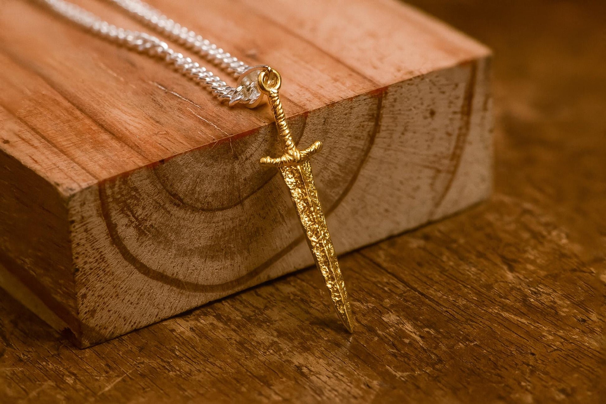 Gold Plated S925 Silver Greatsword Necklace, Fantasy Jewelry Gift for Him, RPG Gamer Pendant, Handmade Sword Charm, Medieval Style Necklace