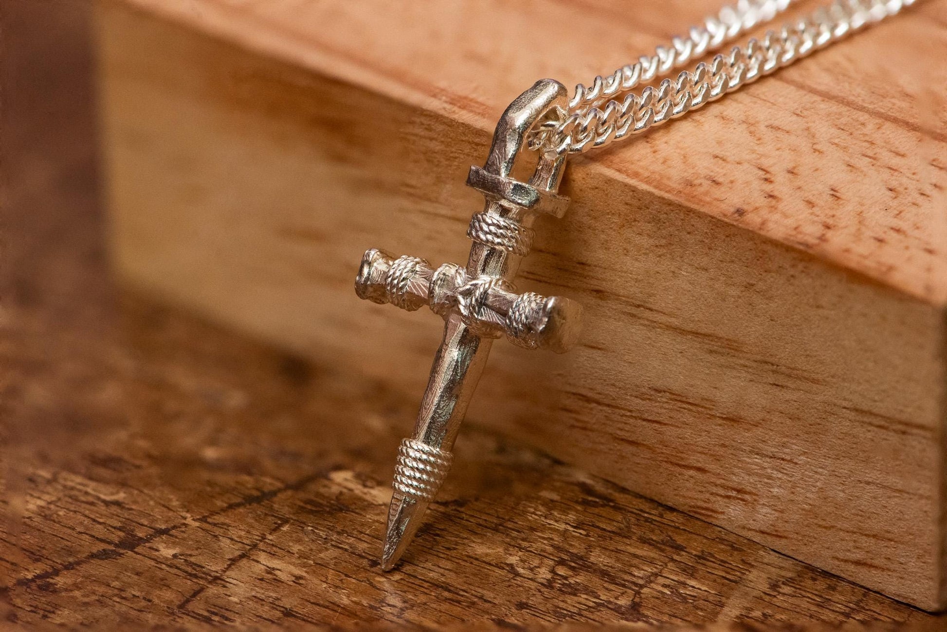 A striking S925 sterling silver nail cross pendant, designed with three forged nails bound together to form a powerful symbol of faith and sacrifice. This handmade silver jewelry blends minimalist detail with gothic style, making it a meaningful religious gift for men or a faith jewelry piece for daily wear.
